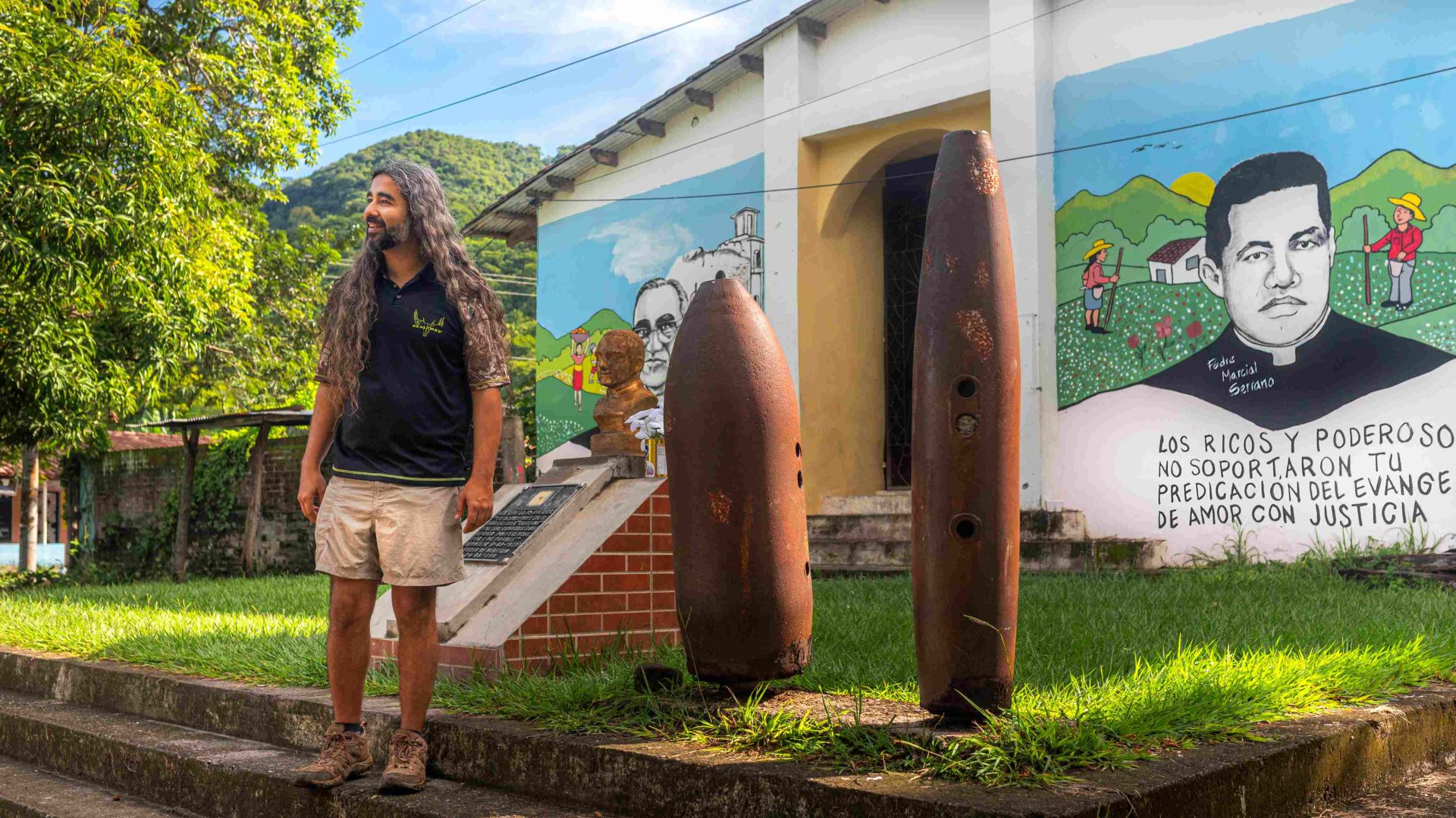 A nearby church with a bullet-riddled bell tower features a mural with painted quotes from Archbishop Oscar Romero and priest Rutilio Grande, alongside the names of Cinquera residents killed in the war. Out front, the priest calls for mass by using 1000-pound unexploded bombs as bells. As fortunate as we were to visit this town, we were even more lucky that the locals were willing to share their stories and educate us on what life was like during those 12 years.