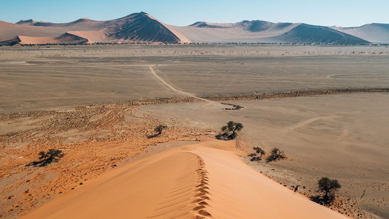 Few words can describe how it feels as you stand before a towering orange sand dune stretching some 300m towards the bright blue sky, walk amongst 900-year-old fossilised Acacia trees in the vast white clay pan of Deadvlei, or touch the shifting sands of the world’s oldest desert, the Namib.