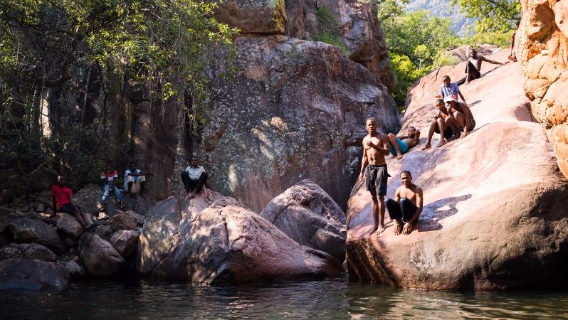 After getting situated in my cosy rondawel, I returned to the group and we hiked to a natural swimming pool. A favourite spot among local teens, the pool was busy with kids jumping off the boulders, horsing around, and enjoying our company as we all splashed together to stay cool. They welcomed us into their fun, egging us on to jump from the surrounding rocks into the water below.
