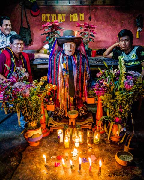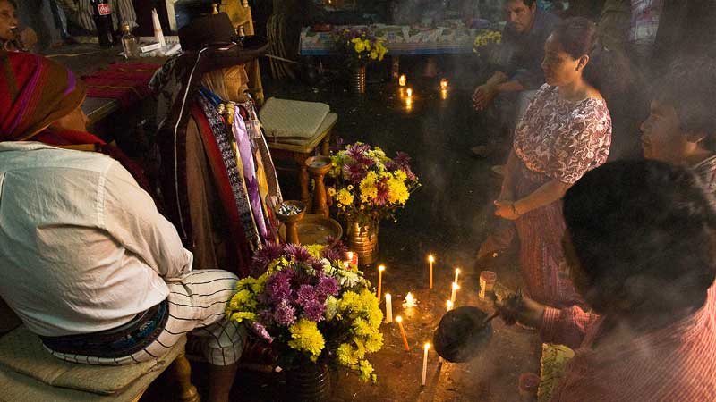 We bought Maximón a couple of cigarettes so he could smoke, and his guardians introduced us to him in Tzutuhil, explained which countries we were coming from and asked for good health and luck and blessings for us. It looked like they were having a casual chat, the guardian resting his arm on Maximón’s shoulder in a brotherly way, stopping his speech every once in a while, as if listening for Maximón’s reply, or simply to tip the ash off his cigarette.