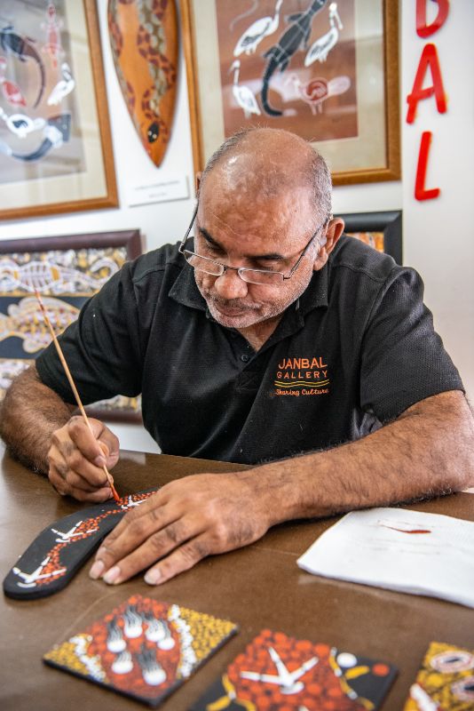 Over the years, Binna had a variety of jobs in addition to painting. He spent time working at Mossmon Gorge, a rainforest area in the Daintree National Park. Here he would find rainforest bush fruits and use them as inspiration for paintings. He also worked in the hospitality industry, but ultimately realised that if he wanted to focus on his art, he would have to dedicate all his time to it, which is why he opened Janbal Gallery in 2008. It’s not only a way to honour his Mum’s memory and showcase his and her artwork, but a way for him to share his culture with people from all around the world.