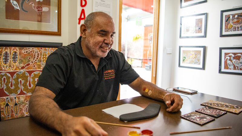 “People want to meet me because I own this gallery a hundred percent as an Aboriginal artist and people can come here and I’ll get off my backside to give the customers a chance to talk to me and see my art. I welcome people myself in my language and offer to help them if they want it or let them walk around. And I explain to them about the artwork and the stories.”
