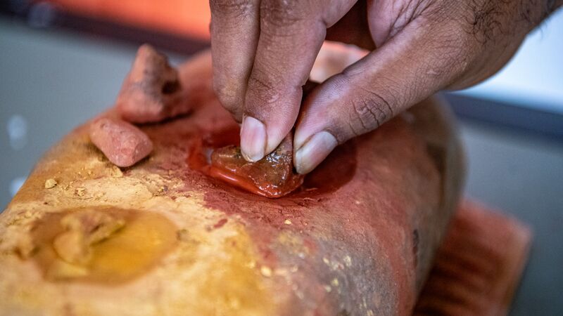 Binna explains how to use the two different ends of the stick to create different sized dots and different thicknesses of lines. It looks simple when he demonstrates, but as I quickly realise when I start painting, his hands are a lot steadier than mine.
