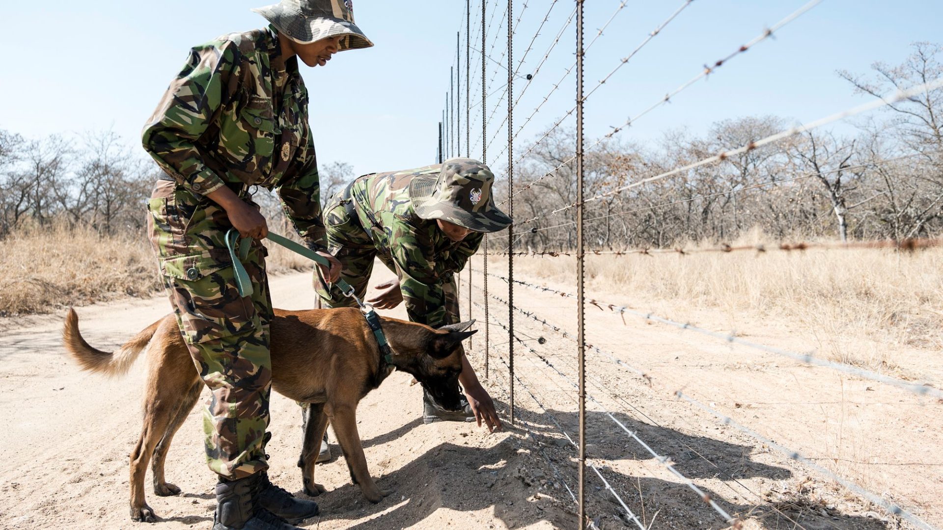 Two members of the Black Mambas anti-poaching unit check the resereve's fenceline with a sniffer dog.