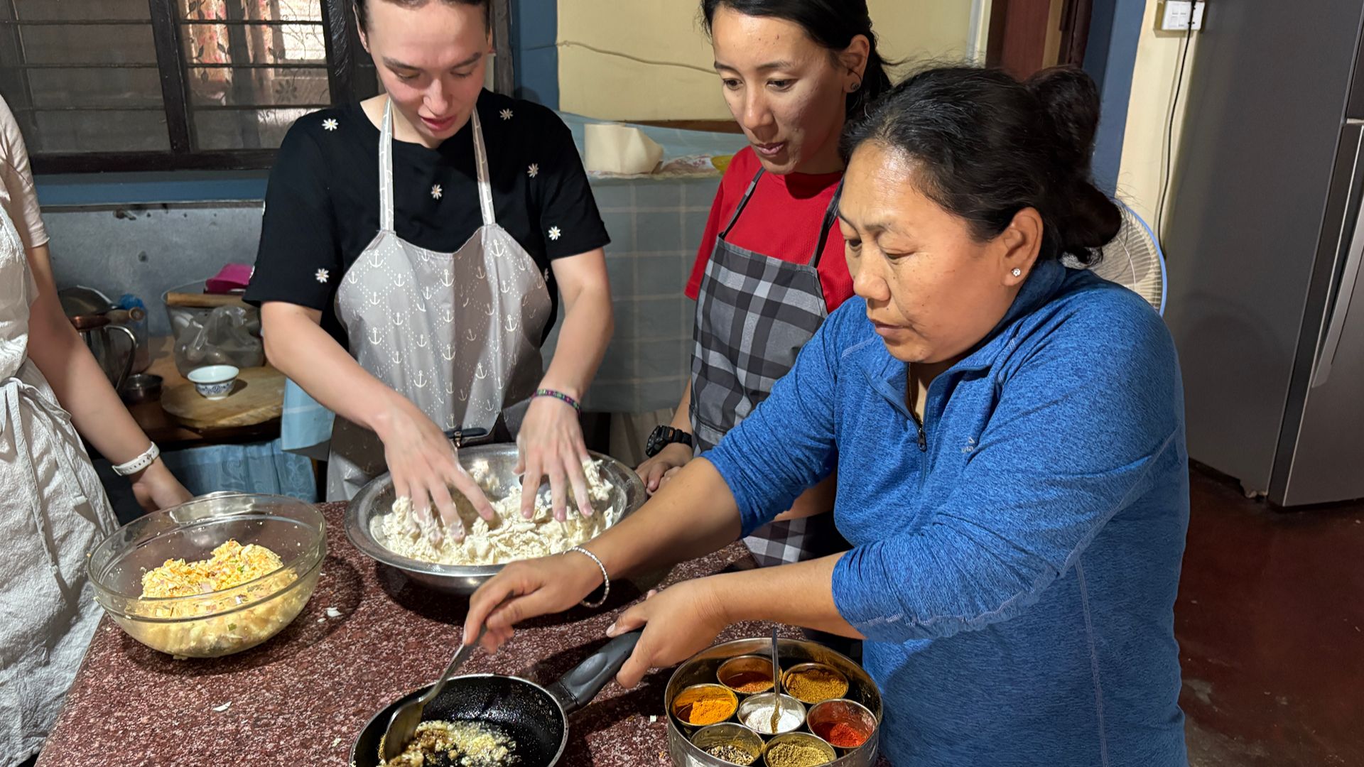 With the fillings ready, it’s time to prepare the dough. Dolma trickles water into a pile of flour before asking Zuzana, my trip roommate from London, to take over. She soon gets into the swing of it, head rocking rhythmically back and forth as she kneads. It’s strangely therapeutic to watch – and it’s in this moment of meditative calm, all gathered around the kitchen bench, that Dolma begins to share her story.