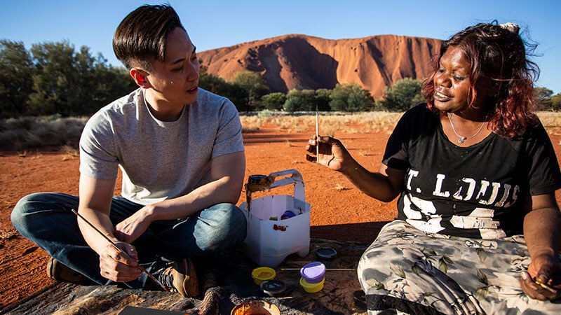 Join our fun, organic and hands on dot painting workshop in the township of Yulara, Uluru. Siting in the red earth with Uluru as your backdrop, you will learn traditional dot painting techniques as well as art symbols and language from a local Anangu artist. Get inspired by the ancient ways of the desert and create your very own work of art to treasure. Through our workshops our artists would like to share a part of their culture with you, so you can learn and create a piece of art to show your family and friends.