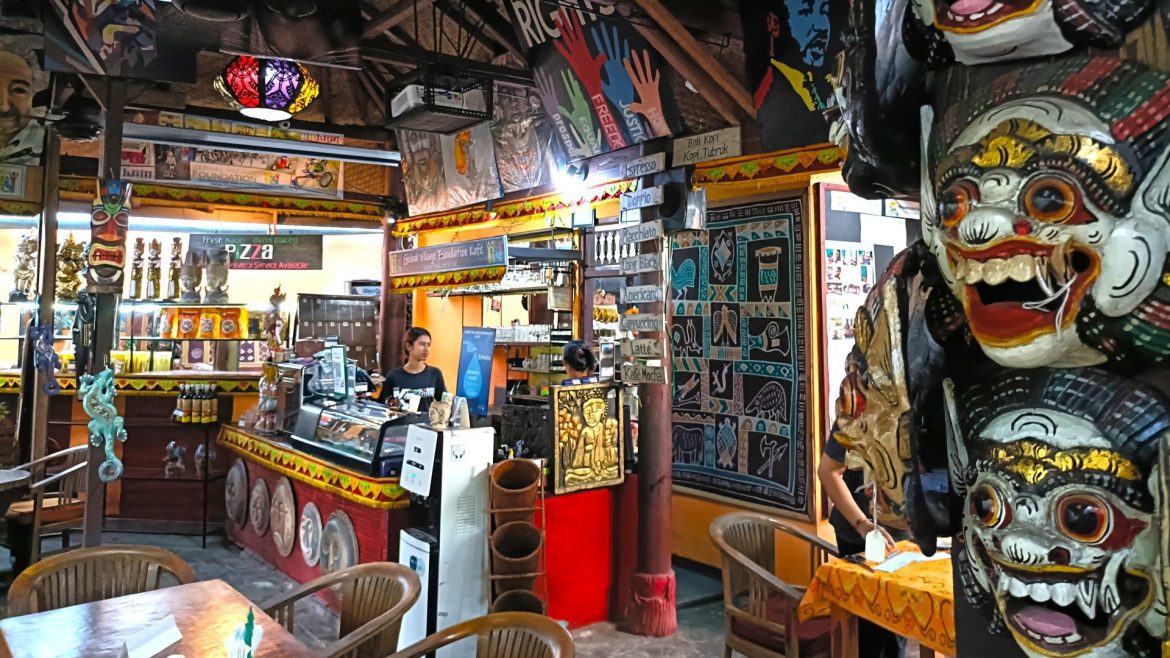 Stepping into Bali’s Global Village Foundation Kafe is like stepping into a home away from home. I almost instantly feel the compassion of this place. Coloured lampshades hang from the ceiling illuminating walls strewn with vintage and retro posters depicting art and inspirational quotes from people like Nelson Mandela. Silver handcrafts tinkle from hooks. Leafy green plants peek through windows.