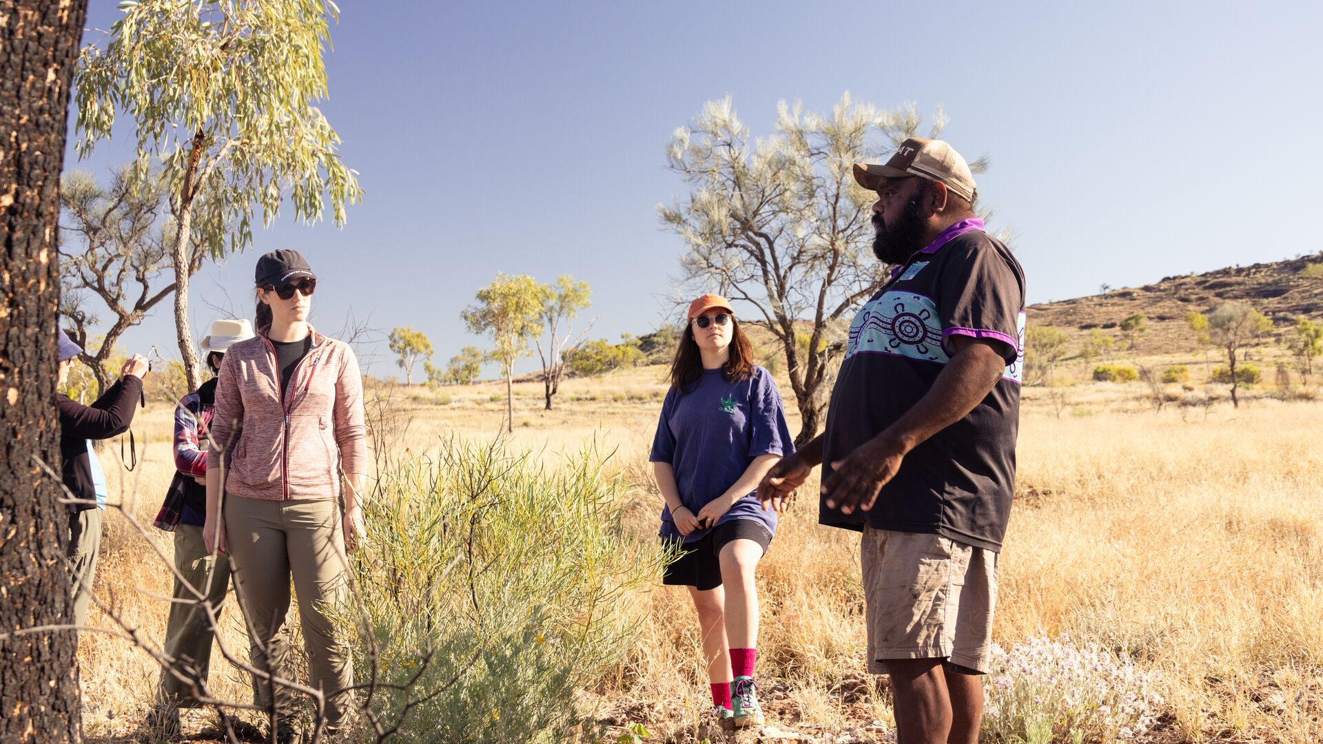 We’re here with our guide Benji Kenny, a Western Arrernte man and Traditional Custodian of the land we’ve been welcomed onto as part of Intrepid’s partnership with 100% Finke River, a First Nations-owned and operated tour company based in Australia’s Red Centre. Benji is a deeply curious cultural conduit who is more than happy to share his stories and wisdom with us as we hike through rust-red gorges, dip in freshwater swimming holes and visit the culturally significant sites on and around his ancestors’ homeland.
