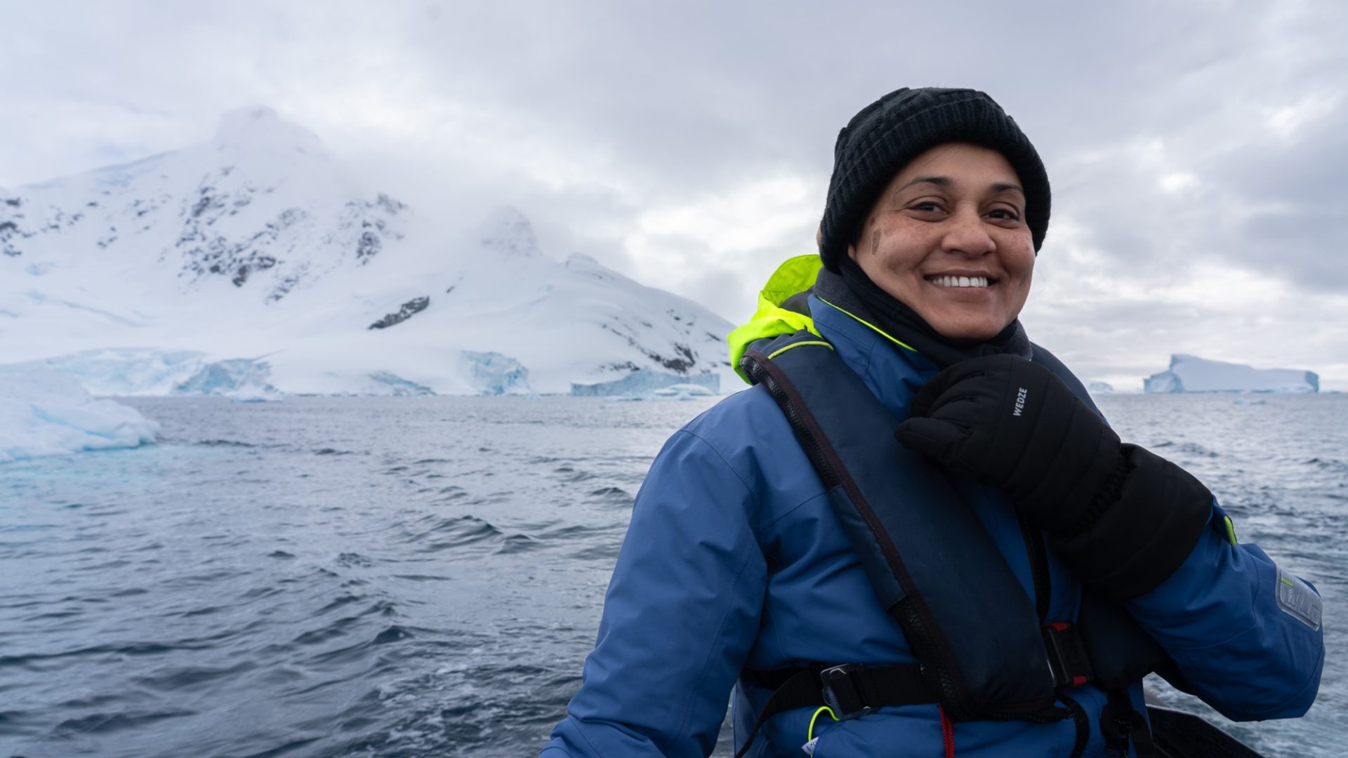Kamla wrapped up warm for Zodiac trips