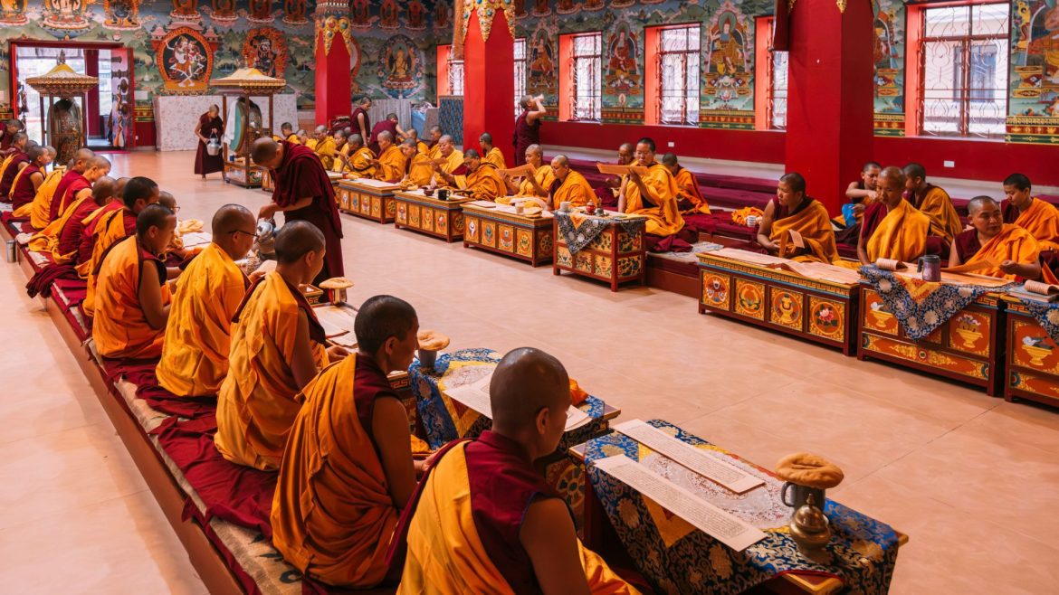 And there, in the middle, sit some 40 nuns singing their morning prayers. To me, it sounds like a mix between a chant and a song. They sit on cushions in two rows facing each other, swaying side to side in unison. Their maroon uniform now has a deep yellow shawl, known as a chogu, wrapped on top. This chogu is worn most typically by nuns who follow the Gelungpa school.