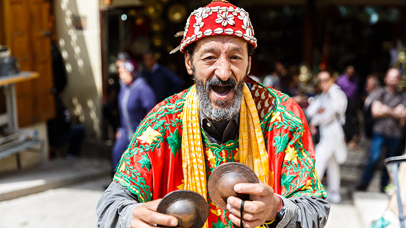 Now it’s time to get lost. We ramble past donkeys and tanneries, are entertained by a man in a famous Fes hat playing local music before we reach a viewpoint over the cities tanneries. Below us, the pools of gold, red and white dye create a perfect picture. Yet for the men who tightrope across the pool edges carrying bundles of animal skins, you can see this is a hard life. Leather shoes are available to purchase in the shop behind in every imaginable colour.