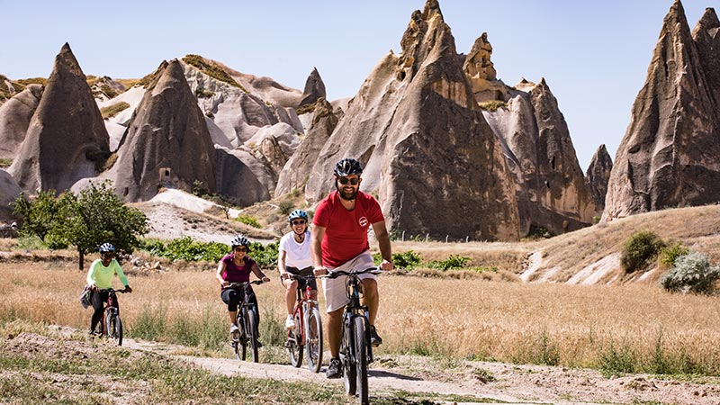 They protrude from the ground, some conical and others undeniably phallic (let’s just say “mushroom-like” to keep things PG rated), formed over millions of years by volcanic eruptions that have been carved away by wind and rain. These otherworldly structures are what make Cappadocia such a unique place. And while viewing them from hot air balloon bestows a sense of scale, mountain biking among them feels like pioneering a new planet.