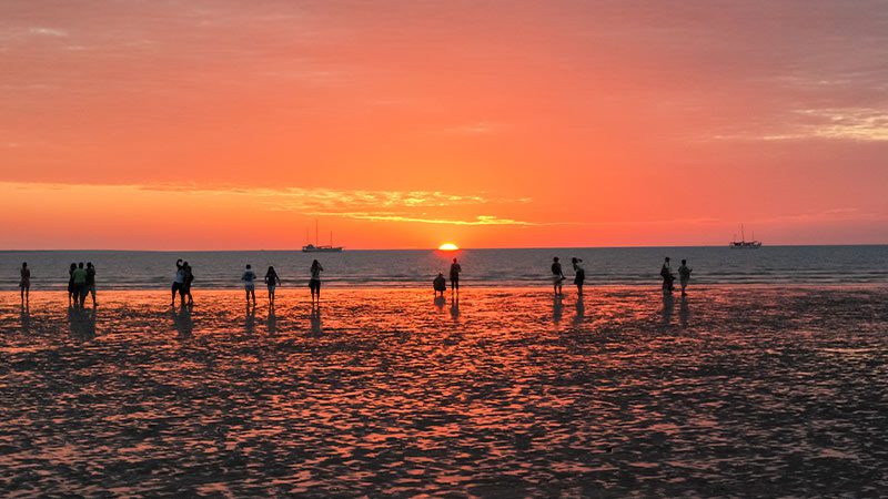 A group of people enjoying Mindil Beach at sunset.