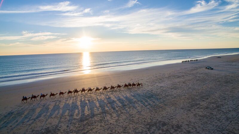 A group of camels walking along Cable Beach in Broome