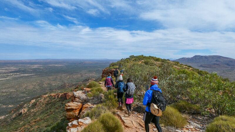 A group of travellers trekking the Larapinta Trail in the Northern Territory.