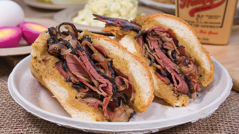 This savory delight is an absolute must due to its unique flavor and the fact that it was originally created as an accident. Yep, you read that right. In 1918, a French chef accidentally dropped the roll he was making into some cooked beef drippings and was going to make a new one, but the customer was in a hurry. In short, the customer took the sandwich, ate it, enjoyed it, and came back the next day for another! Traditionally made with roast beef on a French roll, this sandwich is the most popular thing at Philippe’s with the deli selling up to 3,000 of them a day.
