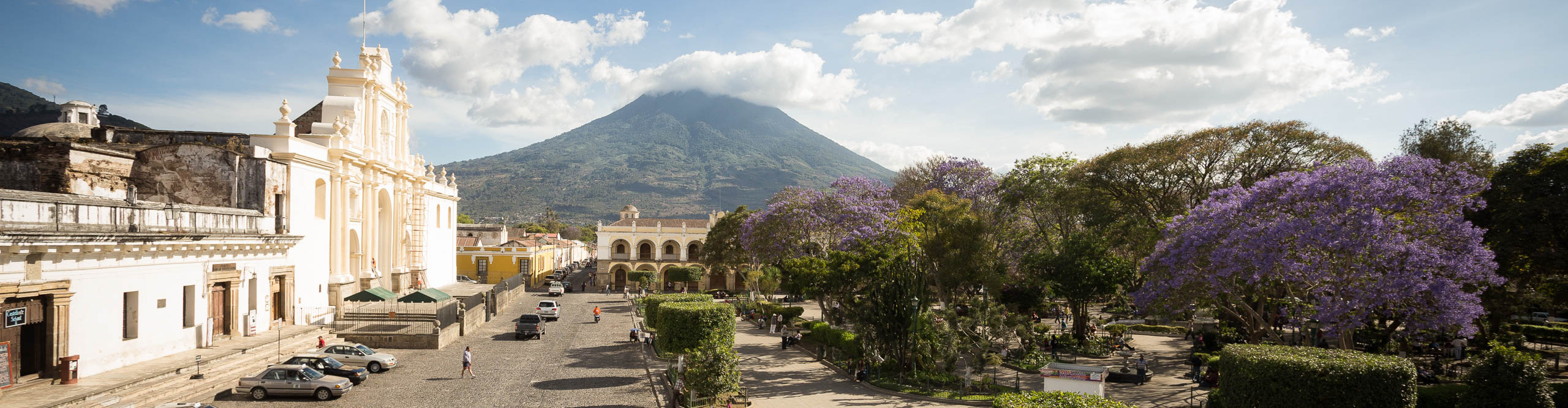 Town square in Antigua with mountain in the distance on a sunny day in Guatemala