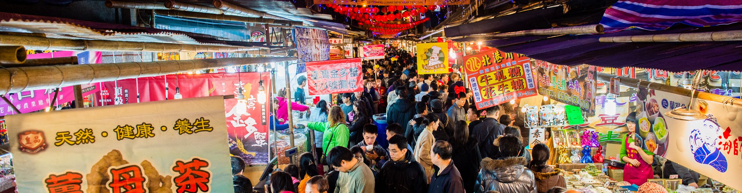 A busy street full of people at a night market in Taipei, Taiwan