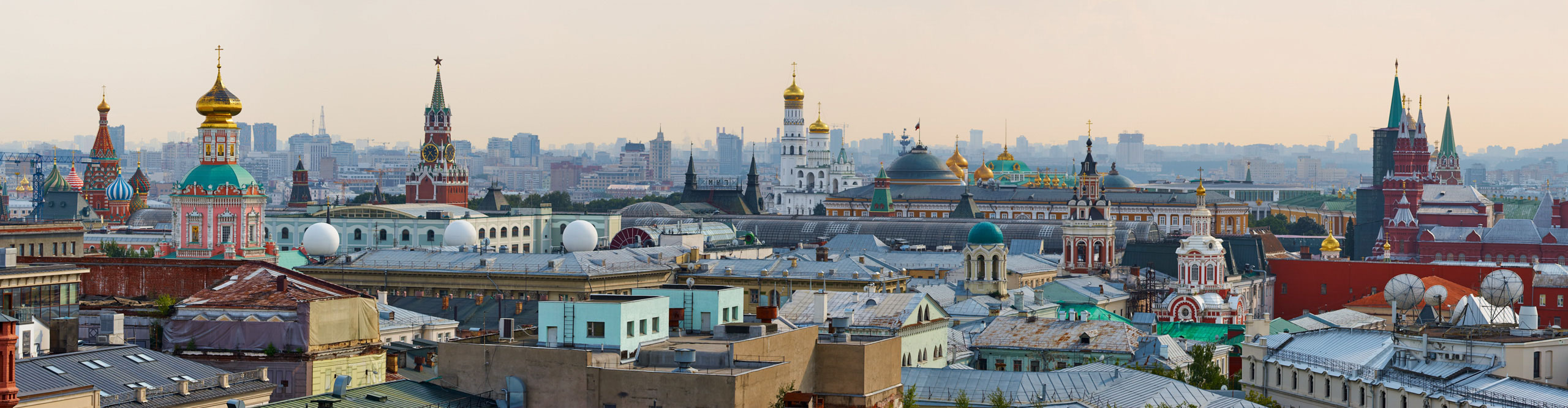 View of rooftops in the center of Moscow overlooking the Kremlin at dusk