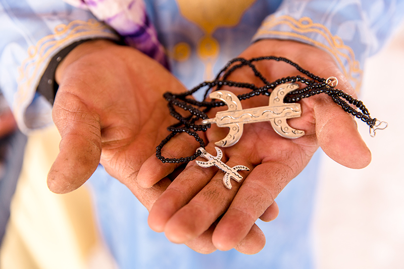 Merzouga is not much more than a few shabby hotels on the edge of the dunes. But of course, the main attraction lies beyond. Camelback is the main mode of transport to enter the dunes, and a row of 10 are majestically lined up for us. Our camel master is a nomad man who stands a few inches shorter than me. His face has aged from the harsh sun, yet his eyes are wild and warm, his comfort in the desert is undeniable. Like every other nomad we’ve met on the journey here, he proudly wears a silver necklace shaped into a Berber compass. Our guide Mustafa explains that people of the desert always know the time and direction based on the sun, stars and moon. While I whip my iPhone out to check which way the sun will set, the nature of these people is to understand the earth based on the sky.