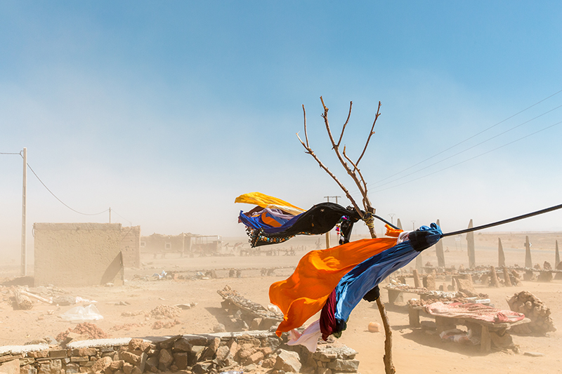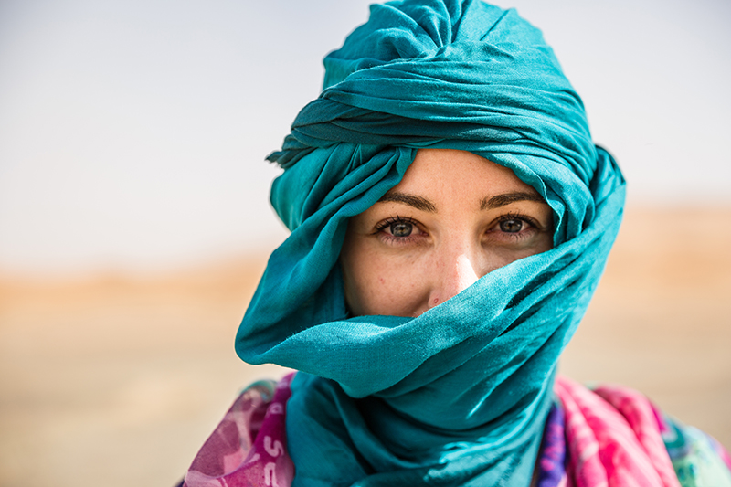 Oases are common in this part of Morocco, where the desert lets go of its unforgiving nature and gives water, palm trees and a place for life to settle. We stop at view points to find green blooming Oases in the valleys below. This is date heaven, and most of the nomadic families in this region have settled to cultivate this sweet fruit. Our lunch stop is in another Oasis Valley, at one of the most idyllic restaurants of the trip. It’s my first taste of Berber omelette, a local dish in the South of Morocco made up of eggs, tomatoes, onions and lashings of herbs. We leave behind the lush oasis valleys and the landscape once again becomes dry and barren. Our final stop is at a Berber shop, where a blue-turbaned man fits our heads with matching scarves. While we take shelter in his tin hut, a sandstorm takes over and the rainbow shawls blow violently in the wind. It’s a reminder of the power of the desert we are about to head into.
