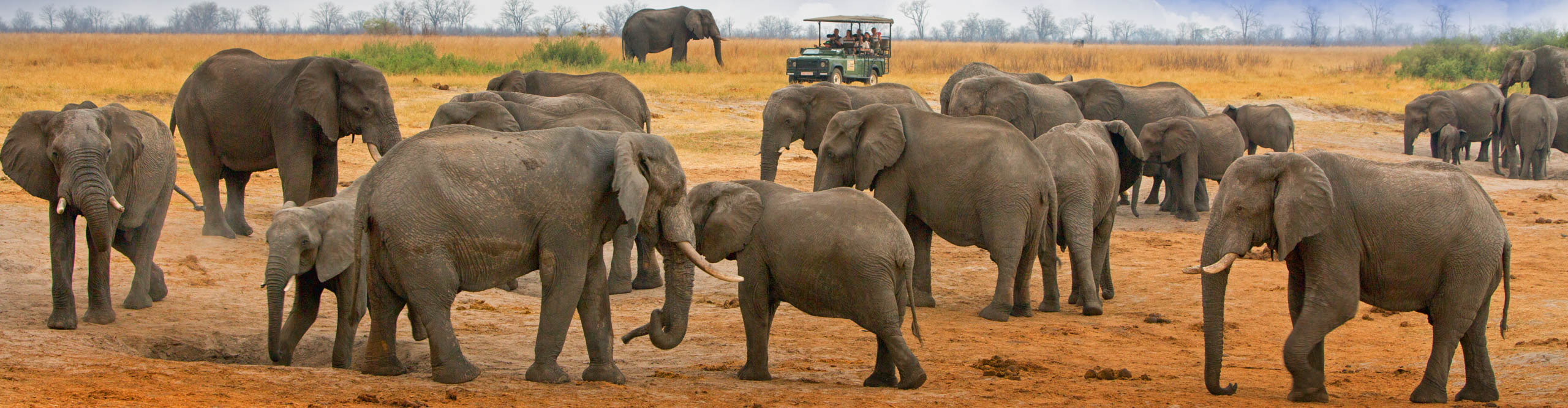 Herd of elephants on the open plains in Hwange national park with a tourist truck, Zimbabwe