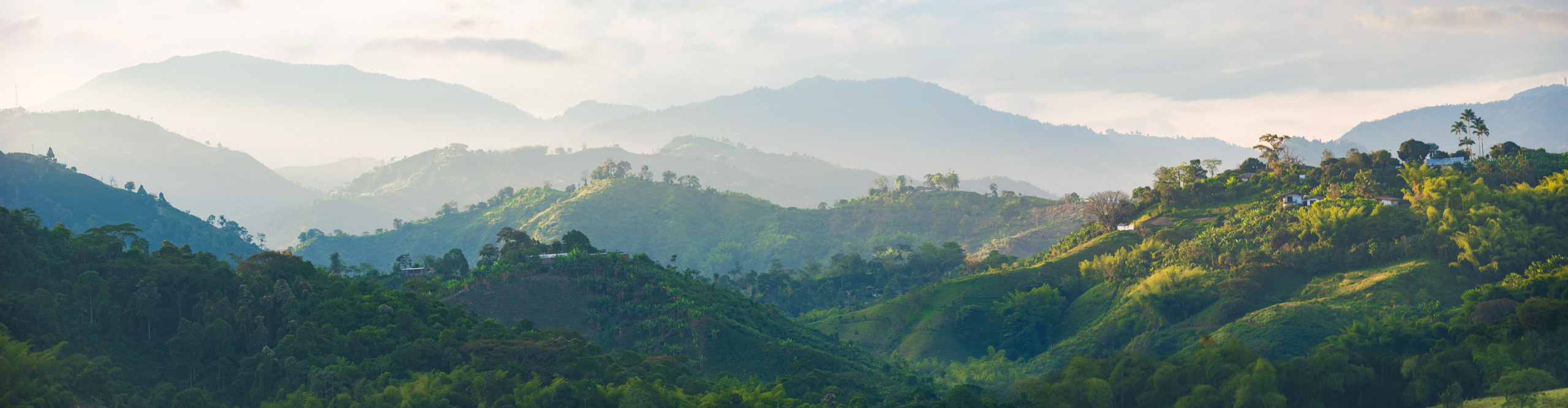 Misty skies at sunset over the green rollings hill of a coffee plantation in Colombia