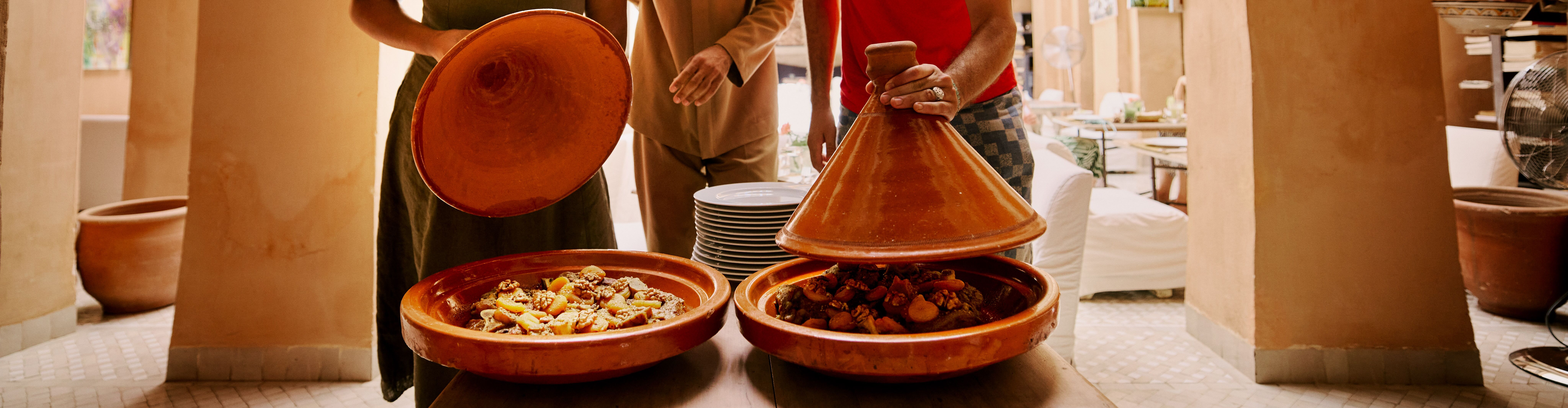 Ah, the iconic Moroccan dish that's stood the test of time. These stews slow-cooked under a cone-shaped lid are the pride and joy of Berber and Moroccan cuisine, with endless variations and combinations of flavours. Chicken, olive and citrus is a well-known favourite, as is lamb or beef with prunes, fish with chermoula, and chicken and apricot. And what's it almost always served with? Khobz, or Middle Eastern flatbread, to mop up all of the sauces.